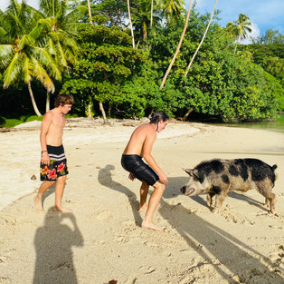 Un chat et un longues oreilles ( ils ne sont pas superstitieux) partagent leur « fare boat ». Ils se déplacent dans le lagon au gré du vent et de leurs humeurs. Le matin les tortues nagent près de leur pirogue pour leur dire bonjour et bientôt les baleines viendront les visiter. Nous avons partagé leur quotidien l’espace d’une journée. Barbecue sur la superbe plage de sable blanc auquel s’est invité un cochon sauvage pour le dessert. Merci les amis. A la revoyure! C’était un moment de grâce...